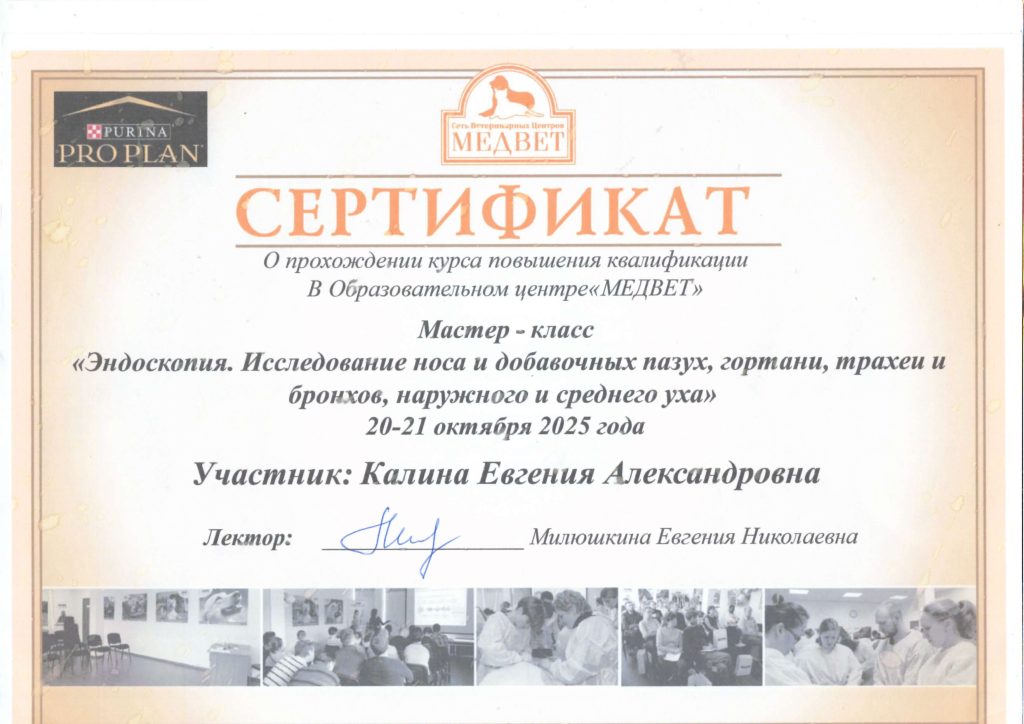 - 29-30.05.24 Приняла участие в мастер-классе SkolkovoVet «Гибкая эндоскопия в исследовании ЖКТ» и получила знания и навыки в соответствии с программой мастер-класса в объёме 21 академического часа, Москва.
