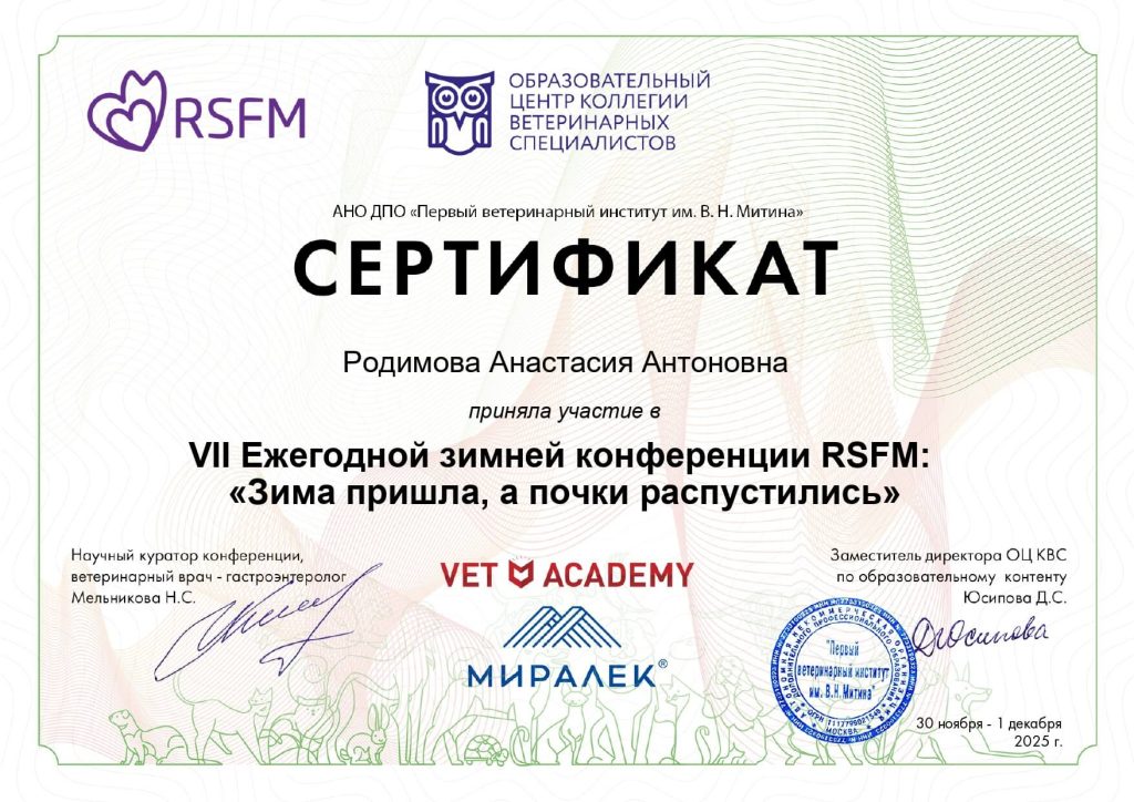 - 30.11.-01.12.2025 Приняла участие в VII Ежегодной зимней конференции RSFM: «Зима пришла, а почки распустились», АНО ДПО «Первый ветеринарный институт им. В.Н. Митина»