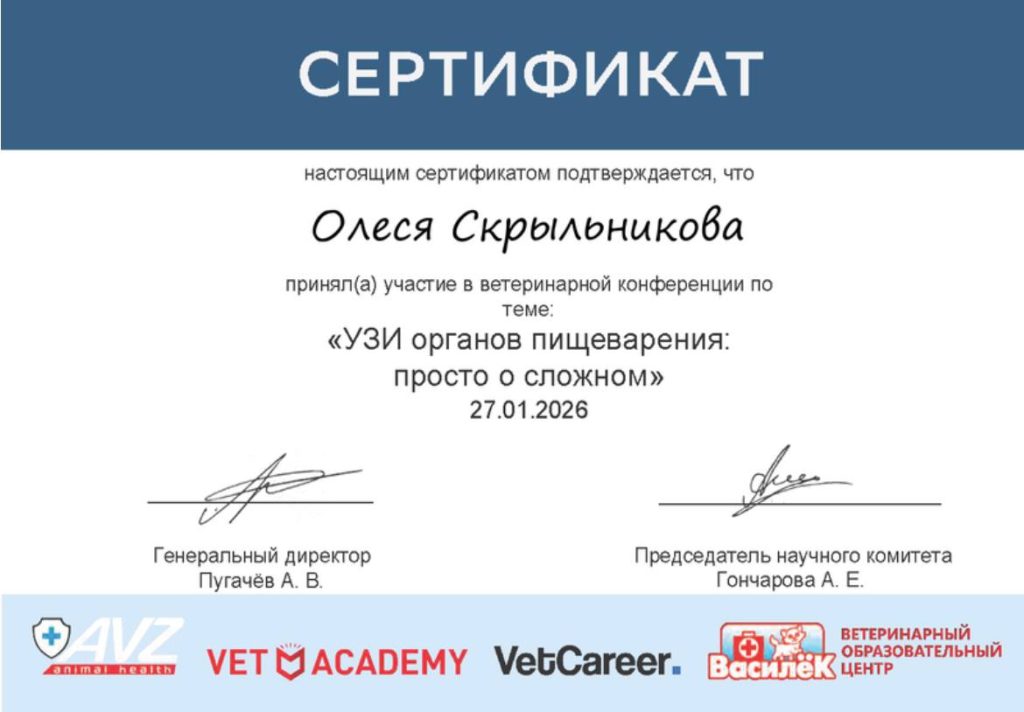 - 27.01.2026 Приняла участие в ветеринарной конференции: «УЗИ органов пищеварения: просто о сложном».